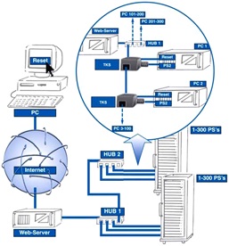 Linux-PC mit Apache Webserver und darauf eingerichteter Telejet Web-Restart- Server-Site und einer RS232-Schnittstelle für bis zu 10 TKS-Hub, also bis zu 3000TKS.