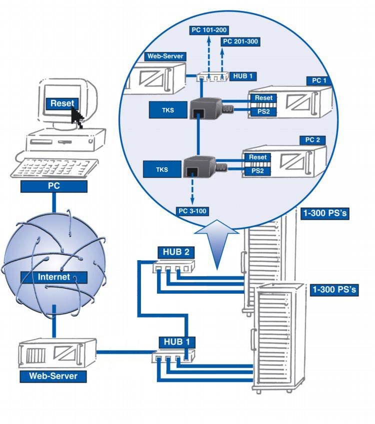Inkl. blauem 25cm Uplink-Kabel, 70cm 2-plg Reset-Kabel, und Tastaturstecker (PS2 oder USB). Die TKS werden nacheinander in Serie an einen TKS-Hub angeschlossen.